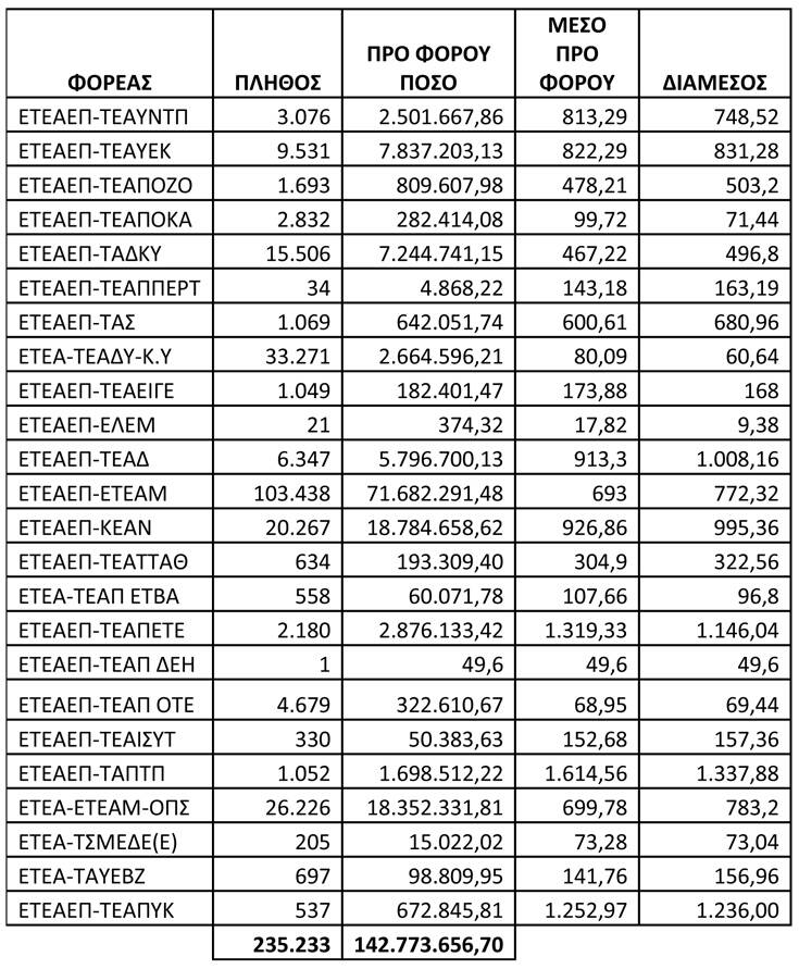 Πίνακας με τα στοιχεία των αναδρομικών ποσών (10/2019 – 05/2020) των ενεργών (σύμφωνα με τα αποστελλόμενα από τους φορείς στοιχεία πληρωμής συντάξεων μηνός 07/2020) επικουρικών συντάξεων, ανά φορέα, και οι οποίες και θα πιστωθούν μέσω ΔΙΑΣ από το ΕΣΕΠΣ: