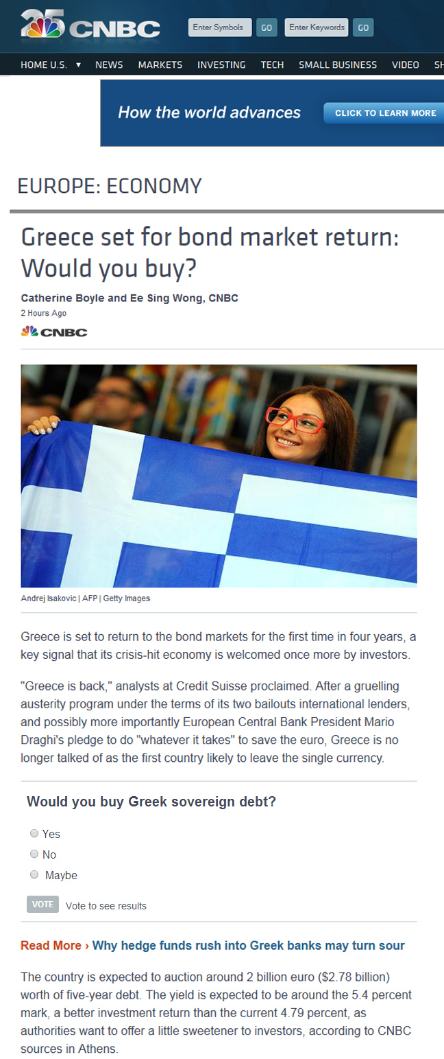 Μάλιστα, στην ιστοσελίδα του φιλοξενεί μια δημοσκόπηση και καλεί τους αναγνώστες του να ψηφίσουν αν θα αγόραζαν ελληνικό χρέος. Από τα μέχρι στιγμής αποτελέσματα φαίνεται πώς η επιστροφή στις αγορές διχάζει, αφού το 46% όσων απάντησαν λέει «ναι», ένα 42% γυρίζει την πλάτη στα ελληνικά ομόλογα και ένα 12% απαντά «Ίσως».