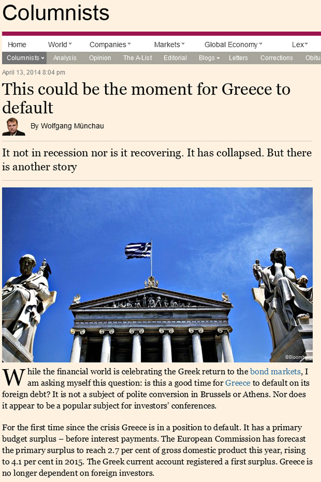 «Την ώρα που ο χρηματοπιστωτικός κόσμος πανηγυρίζει την ελληνική επιστροφή στις αγορές ομολόγων, εγώ αναρωτιέμαι: Είναι αυτή μία καλή στιγμή για την Ελλάδα να κηρύξει στάση πληρωμών στο εξωτερικό της χρέος;». Με τη φράση αυτή ο αρθρογράφος των Financial Times Βόλφγκανγκ Μίνχαου σχολιάζει τις τελευταίες εξελίξεις στην Ελλάδα και εξηγεί γιατί είναι η Ελλάδα είναι πλέον σε θέση να κηρύξει στάση πληρωμών.