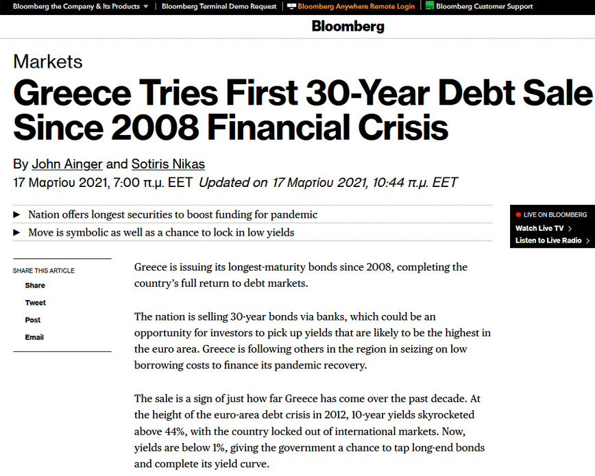 Για την έκδοση 30ετούς ομολόγου από την Ελλάδα γράφει το Bloomberg, σημειώνοντας πως με την κίνηση αυτή, που είναι η πρώτη τόσο μεγάλης διάρκειας από το 2008, η χώρα ολοκληρώνει την πλήρη επάνοδό της στις κεφαλαιαγορές.