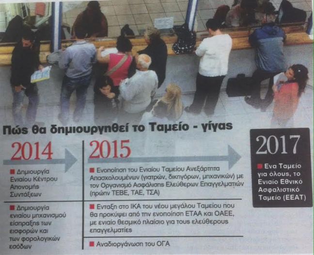 Σε πρώτο πλάνο μέχρι την πλήρη εφαρμογή του μέτρου αναμένεται να μπουν οι ασφαλισμένοι του ΕΤΑΑ (Ενιαίο Ταμείο Ανεξάρτητα Απασχολούμενων) δηλαδή γιατροί, δικηγόροι και μηχανικοί. Εν συνεχεία, προβλέπεται ένταξη στο ΙΚΑ του νέου Ταμείου που θα προκύψει από την ενοποίηση ΕΤΑΑ και ΟΑΕΕ. Αργότερα προβλέπεται αναδιοργάνωση του ΟΓΑ και τέλος θα έρθει το Ταμείο όλων που θα ονομαστεί ΕΕΑΤ, δηλαδή Ενιαίο Εθνικό Ασφαλιστικό Ταμείο, που θα είναι εκτός των άλλων υπεύθυνο τόσο για την είσπραξη ασφαλιστικών όσο και φορολογικών εσόδων, όπως αναφέρουν τα Νέα.