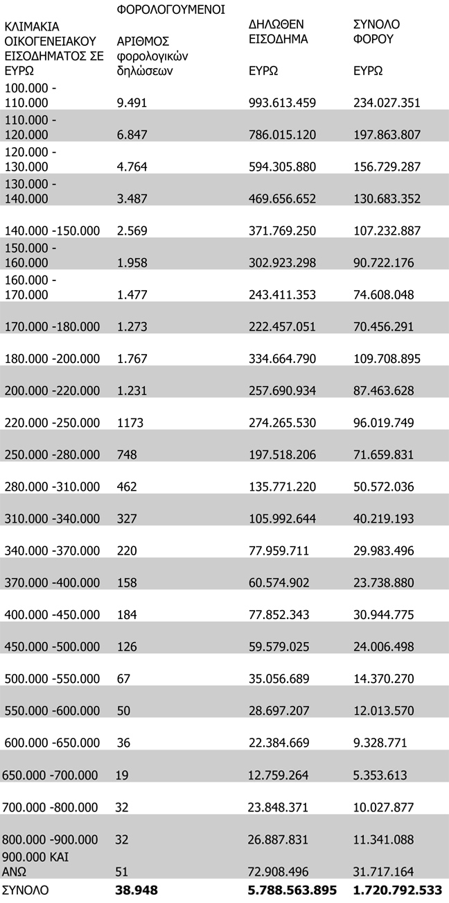 Συγκεκριμένα, με βάση τις δηλώσεις φορολογίας εισοδήματος του 2011 ετήσιο εισόδημα άνω των 100.000 ευρώ δήλωσαν μόλις 38.948 άτομα ή ποσοστό 0,7% του συνόλου των φορολογουμένων. Σε αυτές τις φορολογικές δηλώσεις αντιστοιχεί δηλωθέν εισόδημα 5,7 δισ. ευρώ ή 5,8% του συνόλου του συνολικού δηλωθέντος εισοδήματος και αντίστοιχα φόρος 1,7 δισ. ευρώ ή 23,5% επί του συνολικού φόρου εισοδήματος φυσικών προσώπων.