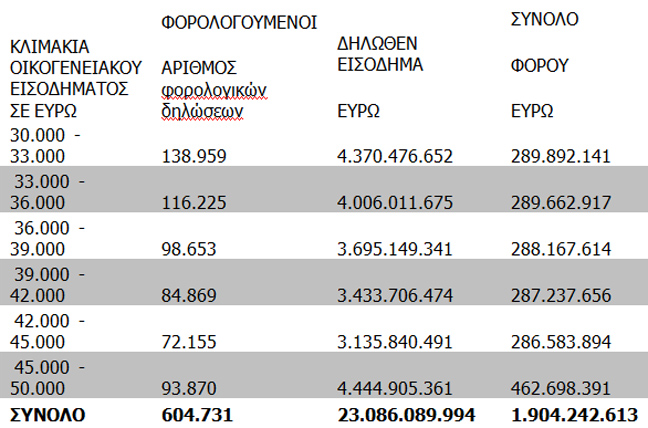 Την ίδια στιγμή τα στοιχεία δείχνουν ότι το κράτος αντλεί περίπου το 27% των φόρων φυσικών προσώπων από εκείνους που δηλώνουν εισοδήματα από 30.000 έως 50.000 ευρώ.