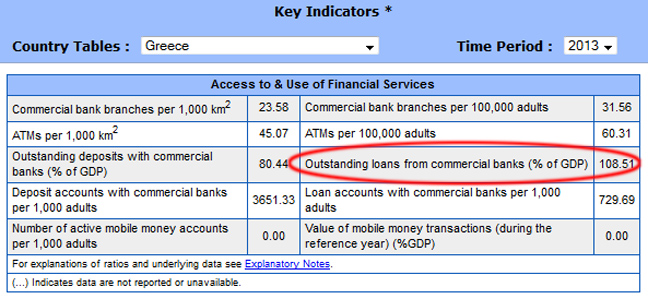 Ειδικότερα, σύμφωνα με τα στοιχεία τα δάνεια στην ελληνική οικονομία διαμορφώθηκαν στο 108,51% του ΑΕΠ το 2013, από 113% το 2012 και 114,64% το 2011, ενώ το 2008 προσέγγιζαν το 82% του ΑΕΠ.