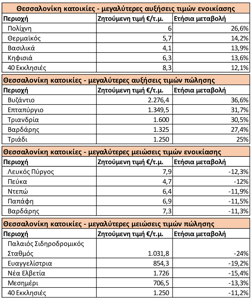 - Στον Δήμο Θεσσαλονίκης, οι ζητούμενες τιμές πώλησης αυξήθηκαν κατά 4,4% ενώ οι τιμές ενοικίασης μειώθηκαν κατά 2,9%.