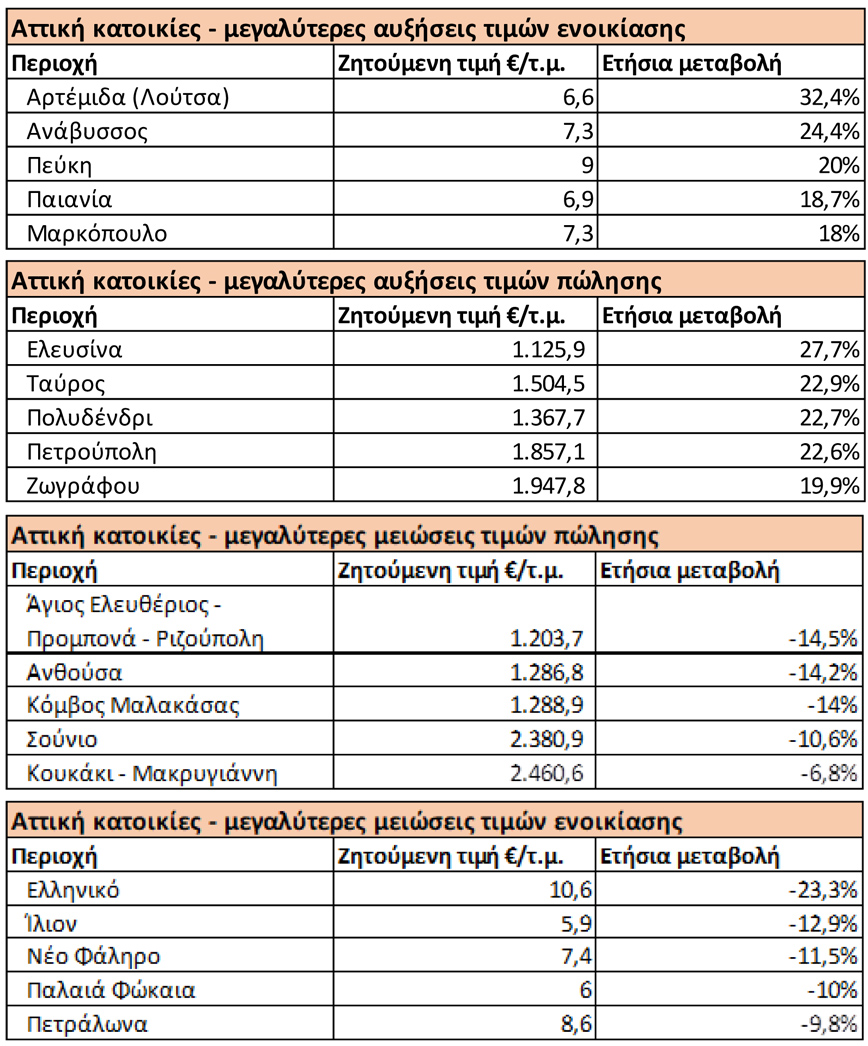 Δείτε πίνακες με παραδείγματα για την Αττική και τη Θεσσαλονίκη και αναλυτικά στοιχεία για τη μεταβολή των ζητούμενων τιμών εντοπίζοντας τις μεγαλύτερες μειώσεις και αυξήσεις σε συγκεκριμένες περιοχές των αντίστοιχων νομών.
