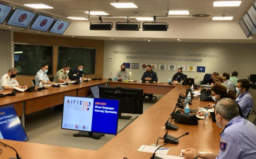 Σύμφωνα με τη σχετική ανακοίνωση, κατά τη σημερινή ευρεία σύσκεψη που πραγματοποιήθηκε στο κτίριο Φάρος, ο υφυπουργός Πολιτικής Προστασίας και Διαχείρισης Κρίσεων, Νίκος Χαρδαλιάς, παρουσίασε τους κεντρικούς άξονες του Εθνικού Σχεδίου 2021-2023 για την Πολιτική Προστασία με την κωδική ονομασία «ΑΙΓΙΣ», στο πλαίσιο του οποίου εντάσσεται το χρηματοδοτικό πρόγραμμα ΕΣΠΑ.