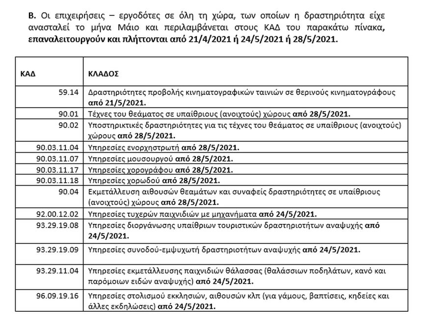Β. Οι επιχειρήσεις-εργοδότες σε όλη τη χώρα, των οποίων η δραστηριότητα είχε ανασταλεί το μήνα Μάιο και περιλαμβάνεται στους ΚΑΔ του πίνακα, που επισυνάπτεται, επαναλειτουργούν και πλήττονται από 21/4/2021 ή 24/5/2021 ή 28/5/2021.