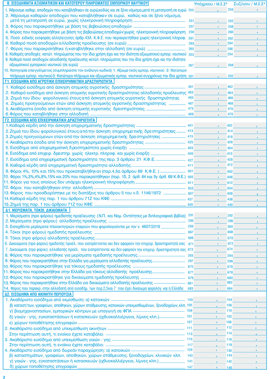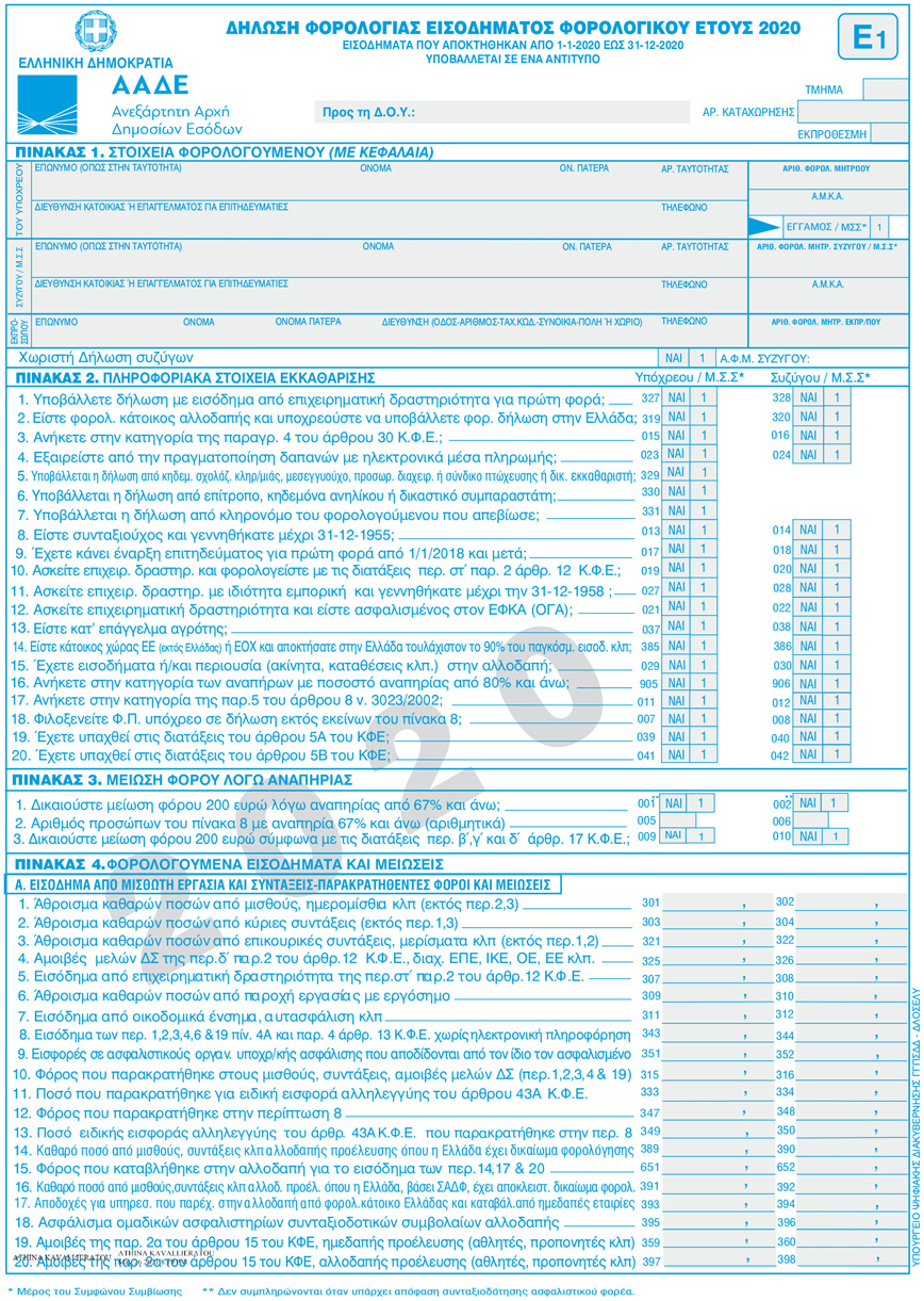 Νέους κωδικούς που αφορούν τις ηλεκτρονικές αποδείξεις, τις ανακαινίσεις ακινήτων, τη φορολόγηση των αθλητών, τους συνταξιούχους του εξωτερικού, την παραγωγή ηλεκτρικών οχημάτων σχεδιάστηκε το νέο έντυπο Ε1 της φορολογικής δήλωσης που θα κληθούν να συμπληρώσουν φέτος περίπου 9 εκατομμύρια φορολογούμενοι.