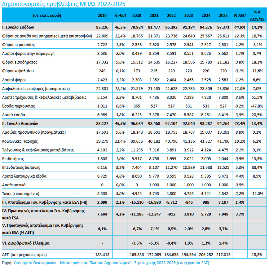 Τα βασικά δημοσιονομικά μεγέθη του ΜΠΔΣ 2022-2025 εξαρτώνται κατά κύριο λόγο από την προσδοκώμενη αύξηση του ΑΕΠ. Σημειώνεται πως τόσο τα έσοδα όσο και οι δαπάνες αναμένεται να αυξηθούν λιγότερο σε σχέση με το ονομαστικό ΑΕΠ, με αποτέλεσμα τα έσοδα ως ποσοστό του ΑΕΠ να περιοριστούν σε 44,9% το 2025 έναντι 46,5% το 2019 και οι δαπάνες σε 43,4% το 2025 έναντι 45,3% το 2019.