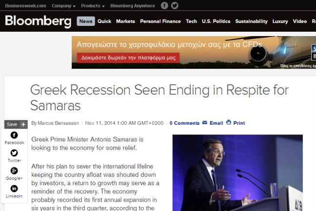 Στην οικονομία στρέφει τις ελπίδες του για κάποια ανακούφιση ο έλληνας πρωθυπουργός Αντώνης Σαμαράς, «ποντάροντας» στην επιστροφή στην ανάπτυξη ως υπενθύμιση πως η χώρα εξέρχεται από την ύφεση, μετά την όχι και τόσο θερμή αντίδραση των επενδυτών στο σχέδιό του για έξοδο της χώρας από το μνημόνιο, γράφει σε σημερινό του δημοσίευμα το πρακτορείο Bloomberg.