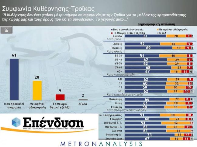 Ανήσυχοι για τη μη επίτευξη συμφωνίας ανάμεσα στην ελληνική κυβέρνηση και την τρόικα εμφανίζονται οι πολίτες, σύμφωνα με δημοσκόπηση της εταιρείας Metron Analysis για λογαριασμό της εφημερίδας «Επένδυση».