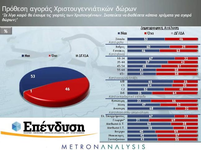 Σε ό,τι αφορά την πρόθεση αγοράς Χριστουγεννιάτικων δώρων, το 46% των ερωτηθέντων δηλώνει ότι δεν θα διαθέσει χρήματα για αγορές ενόψει των εορτών, ενώ ένα 53% απαντά πως θα αγοράσει δώρα.