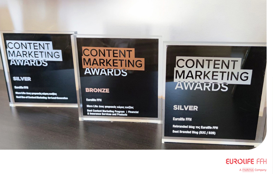 Η Eurolife FFH απέσπασε τρία βραβεία στη φετινή διοργάνωση των Content Marketing Awards, τα οποία απονεμήθηκαν από το Marketing Week και τη Boussias Communications την Τετάρτη 24 Ιουλίου. Στόχος των βραβείων είναι να αναδείξουν ιδέες και δράσεις content marketing που βασίζονται στη στρατηγική μιας επιχείρησης και υλοποιούνται με κριτήρια την καινοτομία, τη δημιουργικότητα και την αποτελεσματικότητά τους. Για τη Eurolife FFH, η διάκρισή της στα βραβεία έχει μεγάλη αξία, καθώς η εταιρεία επενδύει στη δημιουργία περιεχομένου μέσα από τα κανάλια της, αναπτύσσοντας νέους τρόπους επαφής και επικοινωνίας με τους πελάτες και τους συνεργάτες της.