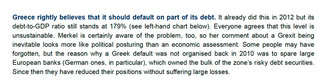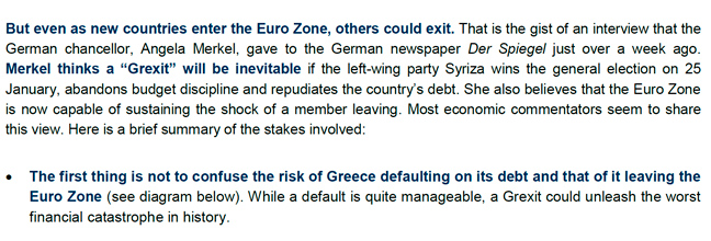 «Ας μην κοροϊδευόμαστε. Ενδεχόμενη έξοδος της Ελλάδας από το ευρώ, όπως και η κατάρρευση της Lehman Brothers, θα προκαλούσε ένα ισχυρό πλήγμα στο διεθνές τραπεζικό σύστημα. Για αυτό, με κίνδυνο να φανούμε θρασείς, θεωρούμε ότι ένα Grexit θα ήταν καταστροφικό για τις χρηματοπιστωτικές αγορές. Δεν πρόκειται να συμβεί».