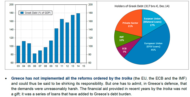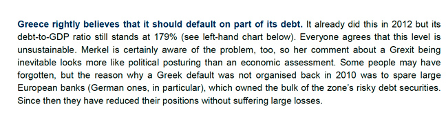 «Η Ελλάδα σωστά πιστεύει ότι δεν πρέπει να πληρώσει μέρος του χρέους της. Ήδη το έκανε αυτό το 2012 με το PSI αλλά ο λόγος που έχει διαμορφωθεί μεταξύ χρέους και ΑΕΠ διαμορφώνεται στο 179%, ποσοστό που το ξαθιστά μη βιώσιμο. Η Merkel το ξέρει αυτό πολύ καλά. Επομένως οι απειλές της για Grexit είναι κούφιες και παραπέμπουν περισσότερο σε πολιτική δήλωση παρά σε οικονομική διαπίστωση. Ορισμένοι το έχουν ξεχάσει, αλλά ο λόγος που δεν οργανώθηκε μια ελληνική χρεοκοπία το 2010, ήταν για να σωθούν οι μεγάλες ευρωπαϊκές τράπεζες (κυρίως οι γερμανικές). Έκτοτε, έχουν μειώσει τις θέσεις τους χωρίς να υποστούν μεγάλες ζημιές».