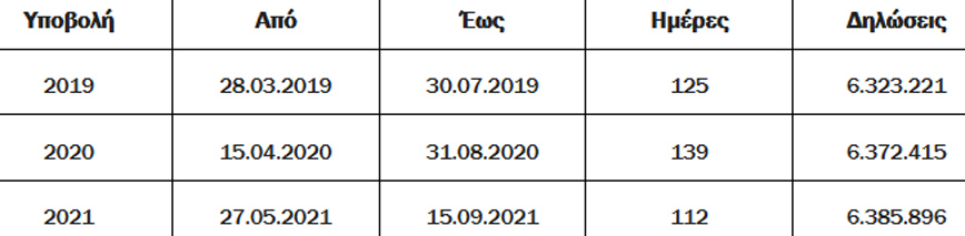 Σύμφωνα με την ΑΑΔΕ πρόκειται για τον μεγαλύτερο αριθμό δηλώσεων, που έχει υποβληθεί εμπρόθεσμα και μάλιστα στο μικρότερο χρονικό διάστημα, όπως άλλωστε φαίνεται από τον ακόλουθο πίνακα: