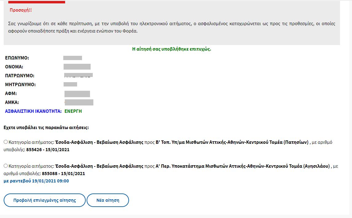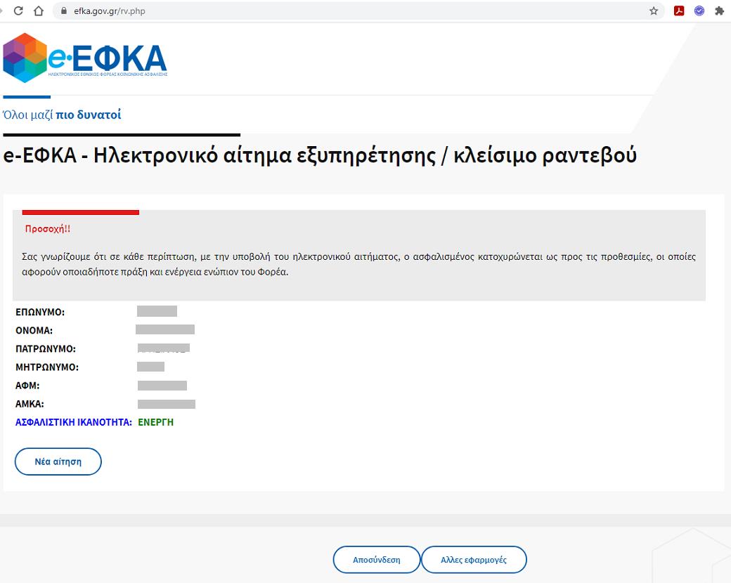 6. Αφού πατήσετε Συνέχεια, εμφανίζονται τα στοιχεία σας και επιλέγετε Νέα αίτηση.
