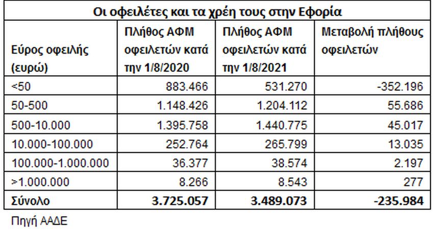 - Με χρέη στην Εφορία εμφανίζονται 3.489.073 φορολογούμενοι έναντι 3.725.057 που ήταν τον Ιούλιο του 2020. Η μείωση του αριθμού των οφειλετών κατά 234.984 πρόσωπα (φυσικά και νομικά) πηγάζει από την κατηγορία οφειλής μέχρι 10 ευρώ, με τον αριθμό των οφειλετών να εμφανίζεται μειωμένος κατά 351.412 πρόσωπα κυρίως λόγω της διαγραφής βεβαιωμένων ανείσπρακτων οφειλών νομικών προσώπων ή τρίτων με εισπρακτέο υπόλοιπο ανά βασική οφειλή μικρότερο του 1 ευρώ. Η διαγραφή οδήγησε σε δραστική μείωση του πλήθους των οφειλετών στην κατηγορία οφειλής μικρότερης του 1 ευρώ κατά 313.673 πρόσωπα σε ετήσια βάση, με τον συνολικό αριθμό των οφειλετών να διαμορφώνεται σε 70.774.