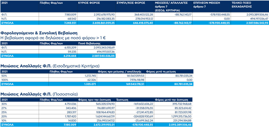 - Συνολικά 7.248.551 φορολογούμενοι έλαβαν εκκαθαριστικό ΕΝΦΙΑ για το έτος 2021. Φόρος βεβαιώθηκε σε 6.214.444 ιδιοκτήτες (με ποσό φόρου άνω του 1 ευρώ) εκ των οποίων 6.155.209 είναι φυσικά πρόσωπα που πληρώνουν 2,093 δις ευρώ και 59.235 είναι νομικά πρόσωπα που πληρώνουν 494,19 εκατ. ευρώ.