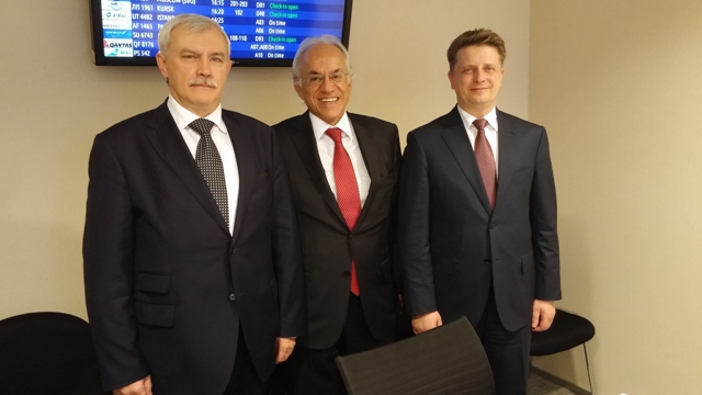 Στη φωτογραφία ο Κυβερνήτης της Αγίας Πετρούπολης, Georgy Poltavchienko, ο Πρόεδρος της Copelouzos Group, Δημήτρης Κοπελούζος και ο Υπουργός Μεταφορών της Ρωσικής Ομοσπονδίας Maxim Sokolov