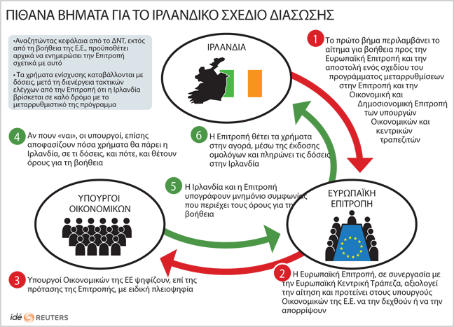 Σε ένα πολύ ενδιαφέρον γράφημά του, το διεθνές ειδησιογραφικό πρακτορείο, Reuters, περιγράφει τον πιθανότερο τρόπο, με τον οποίο θα δοθεί η βοήθεια στην Ιρλανδία για τη διάσωση των τραπεζών της.
