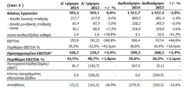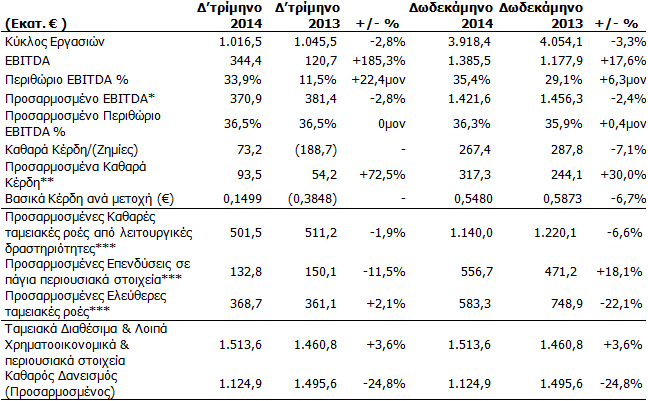 Σημείωση: Όλα τα ποσά είναι προσαρμοσμένα να αποτυπώνουν μόνο τις συνεχιζόμενες δραστηριότητες (οι δραστηριότητες στη Βουλγαρία έχουν αντιμετωπισθεί ως διακοπείσες δραστηριότητες – αλλά η Hellas Sat περιλαμβάνεται στο Δωδεκάμηνο 2013)