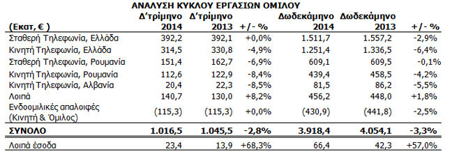 Το Δ’ τρίμηνο του 2014, ο Όμιλος ΟΤΕ κατέγραψε για δεύτερο συνεχόμενο τρίμηνο βελτιωμένες τάσεις στον κύκλο εργασιών σημειώνοντας μείωση 2,8% στα συνολικά ενοποιημένα έσοδα. Εξαιρουμένης της επίδρασης των πρόσφατων αλλαγών στα τέλη τερματισμού, κυρίως στη Ρουμανία από την 1η Απριλίου 2014, τα έσοδα του Ομίλου θα είχαν μείνει σταθερά στο Δ’ τρίμηνο του 2014 σε σχέση με το Δ’ τρίμηνο του 2013.