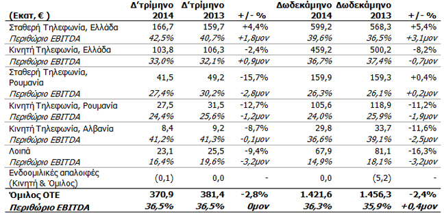 Στη σταθερή τηλεφωνία Ελλάδας, το Δ’ τρίμηνο του 2014 τα έσοδα κατέγραψαν μικρή αύξηση σε σχέση με πέρσι, μετά από 27 τρίμηνα με αρνητικό πρόσημο. Αυτό το επίτευγμα καταδεικνύει την επιτυχημένη μεταστροφή της σταθερής τηλεφωνίας, μετά από τις συνεχείς προσπάθειες για ενίσχυση της εμπειρίας του πελάτη και των προϊόντων και υπηρεσιών. Στην κινητή τηλεφωνία Ελλάδας, τα έσοδα της COSMOTE μειώθηκαν κατά 4,9%, με σταθερές τάσεις βελτίωσης από τρίμηνο σε τρίμηνο. Στη σταθερή τηλεφωνία Ρουμανίας, τα έσοδα μειώθηκαν κατά 6,9% το Δ’ τρίμηνο του 2014, κυρίως λόγω της πτώσης των εσόδων από χονδρική που οφείλεται στην πρόσφατη μείωση των τελών τερματισμού στη χώρα. Τα έσοδα στην κινητή τηλεφωνία Ρουμανίας που μειώθηκαν κατά 8,4%, θα είχαν αυξηθεί κατά σχεδόν 9% εξαιρουμένης της επίδρασης των σημαντικών μειώσεων των τελών τερματισμού τον Απρίλιο του 2014. Παρομοίως, στην Αλβανία, τα έσοδα της AMC μειώθηκαν κατά 8,5%, ενώ θα είχαν αυξηθεί κατά 8% χωρίς την επίδραση της μείωσης των τελών τερματισμού. Τέλος, τα λοιπά έσοδα του Ομίλου διαμορφώθηκαν στα €140,7 εκατ. σημειώνοντας αύξηση 8,2%, κυρίως λόγω αύξησης της κίνησης στην OTE Globe.