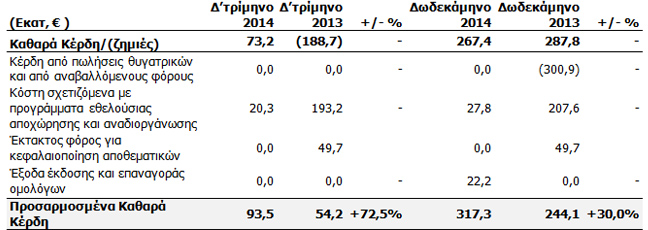 Τα προσαρμοσμένα καθαρά κέρδη του Ομίλου ανήλθαν σε €93,5 εκατ. το Δ’ τρίμηνο του 2014, αυξημένα κατά 72,5% σε σχέση με τα €54,2 εκατ. το Δ’ τρίμηνο του 2013. Τα ετήσια καθαρά κέρδη της ΟΤΕ Α.Ε. ανήλθαν σε €110 εκατ.