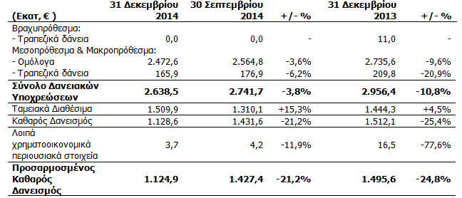 Ο προσαρμοσμένος καθαρός δανεισμός του Ομίλου διαμορφώθηκε σε €1,1 δισ. στις 31 Δεκεμβρίου 2014, μειωμένος κατά 21,2% σε σχέση με τις 30 Σεπτεμβρίου του 2014, που αντιστοιχεί σε 0,8 φορές το προσαρμοσμένο ετήσιο ΕΒΙTDA του Ομίλου.