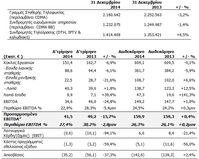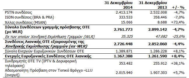 Το Δ’ τρίμηνο του 2014, η συνολική αγορά στην Ελλάδα (ενεργοί συνδρομητές λιανικής ΟΤΕ, χονδρική εκμίσθωση γραμμών και συνδρομητές πλήρους Αδεσμοποίητης Πρόσβασης στον Τοπικό Βρόχο) γύρισε θετική, μετά από πολλά χρόνια συρρίκνωσης, με την προσθήκη περισσότερων από 5.000 γραμμών. Η σταθερή τηλεφωνία του ΟΤΕ στην Ελλάδα κατέγραψε καθαρή απώλεια 22.000 γραμμών πρόσβασης λιανικής έναντι 49.000 γραμμών το Δ’ τρίμηνο του 2013 και 31.000 γραμμών το Γ’ τρίμηνο του 2014. Στο τρίμηνο, οι καθαρές νέες συνδέσεις που κατέγραψε ο ανταγωνισμός διαμορφώθηκαν σε 28.000 σε σχέση με 43.000 το Δ’ τρίμηνο του 2013.