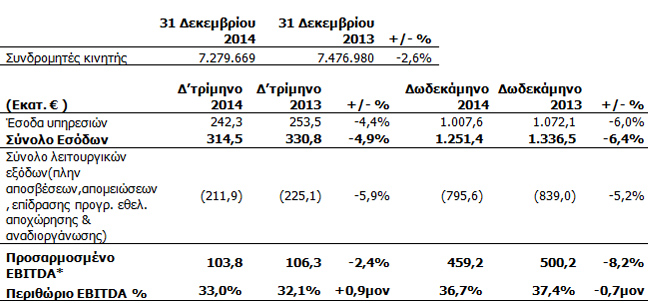 Στο τέλος του Δ’ τριμήνου 2014, η Cosmote παρείχε υπηρεσίες κινητής τηλεφωνίας σε 7,3 εκατ. πελάτες στην Ελλάδα, κατά 2,6% λιγότερους από τις 31 Δεκεμβρίου 2013.