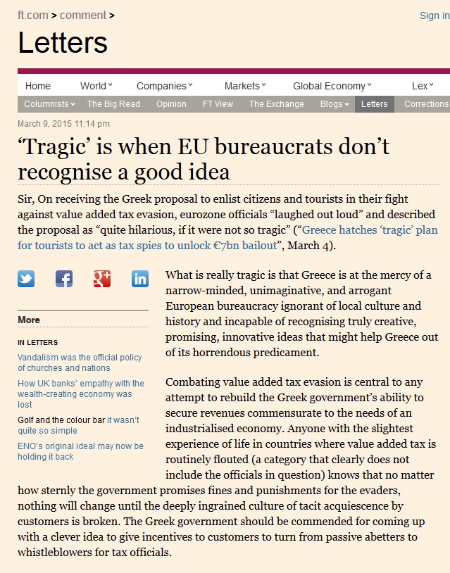 Τους «μυστικούς εφοριακούς» του Γιάννη Βαρουφάκη που θα κυνηγήσουν τη φοροδιαφυγή και προκάλεσαν τα καυστικά σχόλια στην Ευρώπη και το εσωτερικό σχολιάζει ο καθηγητής του London School of Economics, Φραντσέσκο Κασέλι, με άρθρο του στους Financial Times, στο οποίο εξαπολύει πυρά προς τους στενόμυαλους ευρωπαίους γραφειοκράτες «που δεν μπορούν να δουν μπροστά τους μια πάρα πολύ καλή ιδέα».