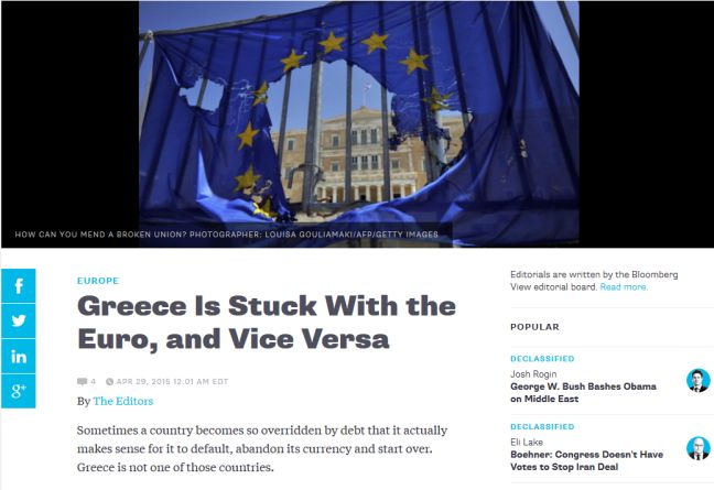 Κάποιες φορές μια χώρα είναι τόσο υπερχρεωμένη, που είναι λογικό να πτωχεύσει, να εγκαταλείψει το νόμισμά της και να ξεκινήσει από την αρχή. Η Ελλάδα δεν είναι μία από αυτές τις χώρες, γράφουν οι συντάκτες του Bloomberg σε άρθρο τους με τίτλο «Η Ελλάδα είναι κολλημένη με το ευρώ και αντίστροφα».