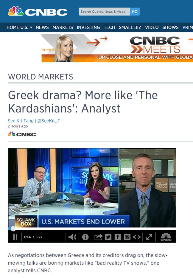 «Η κατάσταση της Ελλάδας μοιάζει με το ριάλιτι “Καρντάσιανς”. Αρχικά ήταν πολύ ενδιαφέρουσα και δημοφιλής, αλλά πλέον οι άνθρωποι βαριούνται και η ιστορία έχει γίνει ξεπερασμένη», δηλώνει ο επικεφαλής στρατηγικής στη Wells Fargo, Μπράιαν Γιάκομπσεν.