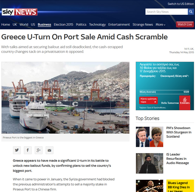 «Όταν κέρδισε τις εκλογές τον Ιανουάριο, η κυβέρνηση του ΣΥΡΙΖΑ μπλόκαρε τις προσπάθειες της προηγούμενης κυβέρνησης να πουλήσει το πλειοψηφικό πακέτο του λιμανιού του Πειραιά σε κινεζική εταιρεία», συνεχίζει το Skynews, ερμηνεύοντας την αλλαγή στάσης ως αντίδραση στην επιδείνωση των οικονομικών της χώρας.