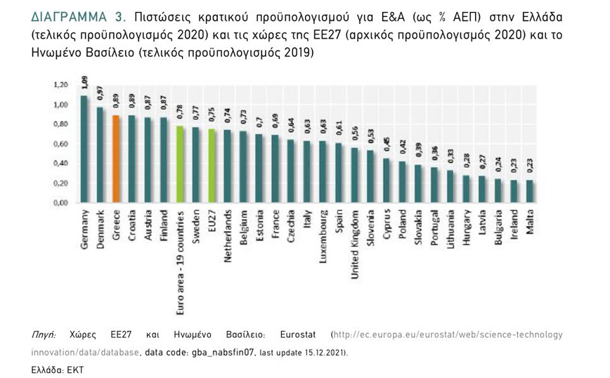Πιο συγκεκριμένα, όπως αναφέρεται σε ανακοίνωση του υπουργείου Ανάπτυξης και Επενδύσεων με τίτλο «ρεκόρ κρατικής χρηματοδότησης για Έρευνα και Ανάπτυξη το 2020», το 2020, οι πιστώσεις του κρατικού προϋπολογισμού για Έρευνα και Ανάπτυξη στην Ελλάδα αποτελούν το 0,89% του ΑΕΠ και την κατατάσσουν πλέον στην 3η θέση στην Ε.Ε. των 27, πάνω από τον μέσο όρο της Ευρώπης των 27 (0,67%) αλλά και της Ευρωζώνης (0,69%).