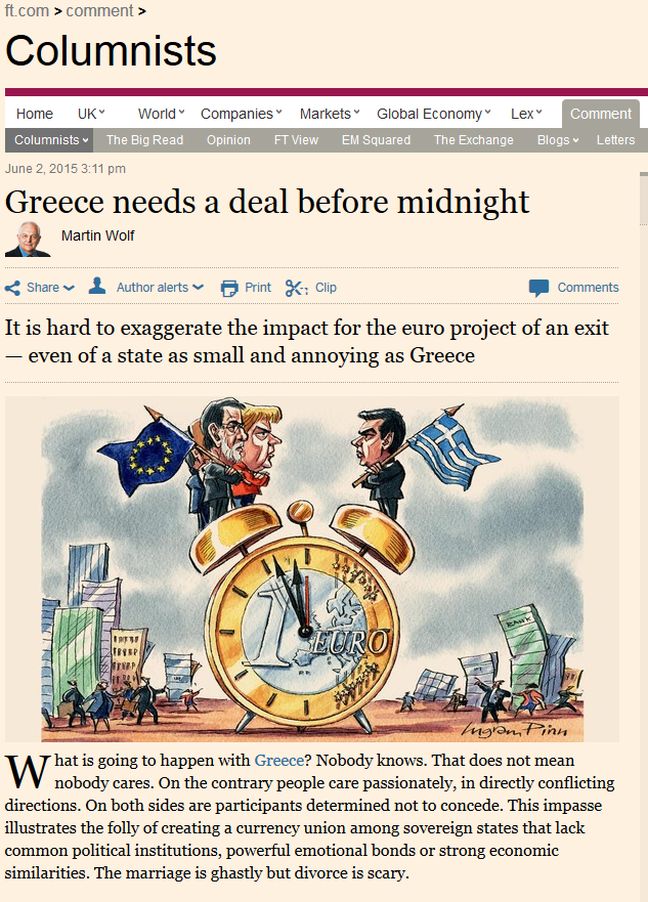 Σύμφωνα με τους FT, «η Ελλάδα βρίσκεται πλέον στο χείλος της χρεοκοπίας. Αυτό τον μήνα καλείται να πληρώσει 1,5 δισ. ευρώ στο ΔΝΤ και άλλα 452 εκατ. ευρώ προς το Ταμείο και 3,5 δισ. ευρώ προς την Ευρωπαϊκή Κεντρική Τράπεζα τον άλλο μήνα. Και επιπλέον 176 εκατ. ευρώ προς το ΔΝΤ και 3,2 δισ. ευρώ προς την ΕΚΤ τον Αύγουστο. Χωρίς συμφωνία, η Αθήνα θα αναγκαστεί να κηρύξει στάση πληρωμών. Δεν έχει άλλη πηγή εσόδων. Η πρόσβασή της στις αγορές είναι κλειστή».