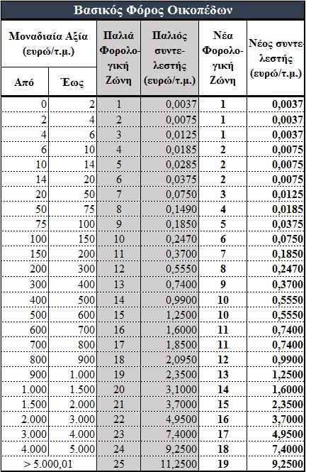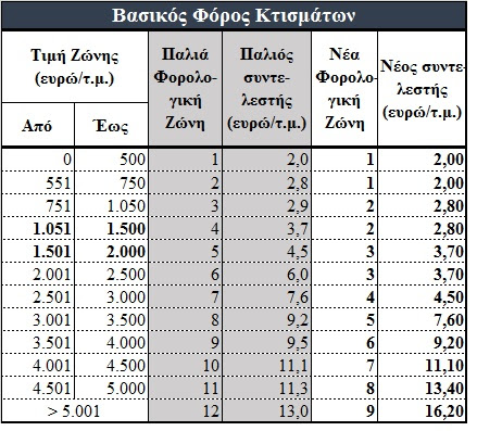 - για τιμή ζώνης από 1.501 έως 2.500 ευρώ ο συντελεστής διαμορφώνεται σε 3,70 ευρώ/τ.μ., ενώ με το ισχύον καθεστώς για τιμή ζώνης από 1.501 έως 2.000 ευρώ ο συντελεστής είναι 4,5 ευρώ/τ.μ. και από 2.001 έως 2.500 είναι 6 ευρώ/τ.μ.