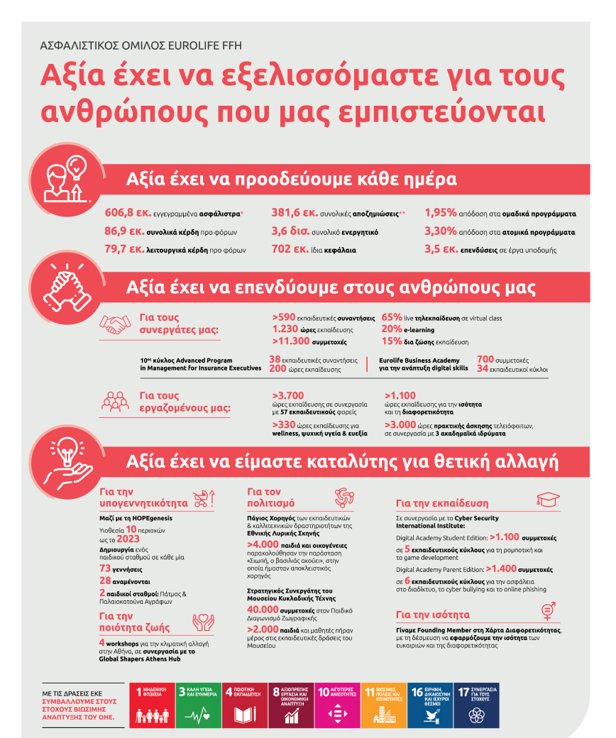 Για τον Όμιλο Eurolife FFH, μέλος του ομίλου της Fairfax Financial Holdings Limited, το 2021 ήταν μια χρονιά σημαντικών οικονομικών επιδόσεων που επιβεβαιώνουν την ηγετική του θέση στην ελληνική ασφαλιστική αγορά. Για τον Όμιλο, αξία έχει να εξελίσσεται κάθε ημέρα, ακολουθώντας ένα σταθερό πλάνο ανάπτυξης που αποδίδει, με στόχο να προσφέρει περισσότερα σε κάθε άνθρωπο που τον εμπιστεύεται και στην κοινωνία ευρύτερα.