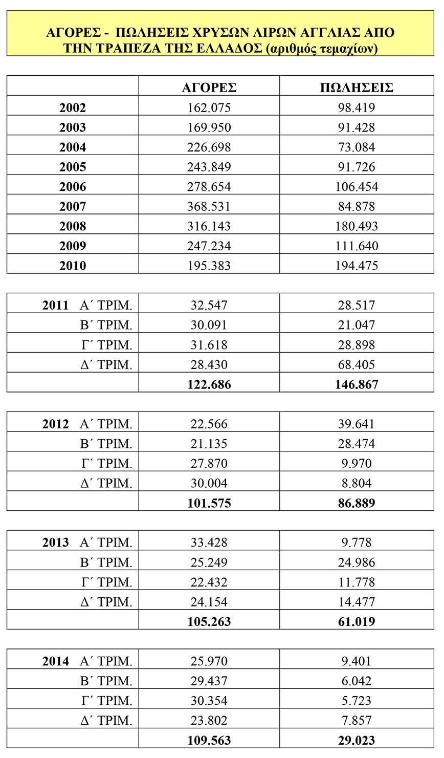 Αντιστοίχως από τον Ιανουάριο έως τον Μάρτιο του τρέχοντος έτους πουλήθηκαν από ιδιώτες στην Τράπεζα της Ελλάδος μόλις 3.568 χρυσές λίρες, οι λιγότερες σε ένα τρίμηνο των τελευταίων δύο δεκαετιών που κυκλοφορεί το ευρώ.
