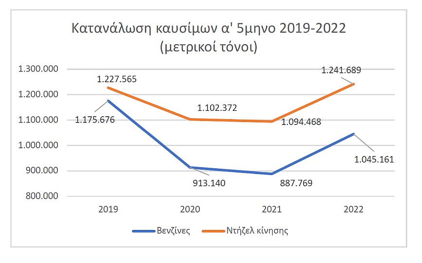 -Για το ντήζελ κίνησης αντίστοιχα η κατανάλωση ήταν εφέτος 1.241.689 ΜΤ έναντι 1.094.468 το 2021 (+13 %) και 1.227.565 ΜΤ το 2019 (+1% στην τριετία).