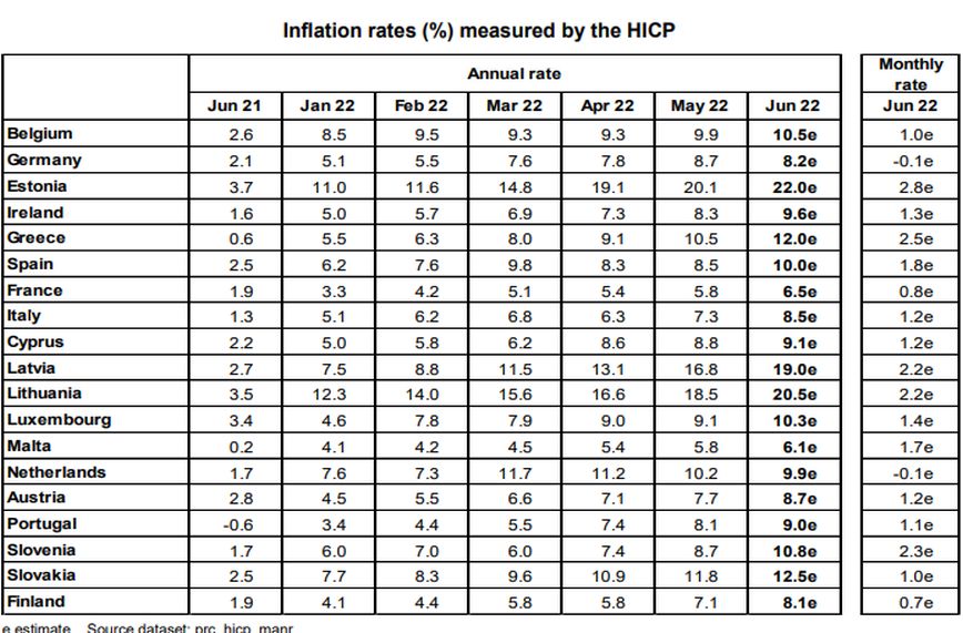 Το υψηλότερο επίπεδο πληθωρισμού στην ευρωζώνη καταγράφουν τον Ιούνιο η Εσθονία (22%), η Λιθουανία (20,5%), η Λετονία (19%), η Σλοβακία (12,5%) και η Ελλάδα (12%). Το χαμηλότερο πληθωρισμό καταγράφουν η Μάλτα (6,1%), η Γαλλία (6,5%), η Φινλανδία (8,1%) και η Γερμανία (8,2%), σύμφωνα με ανταπόκριση του Αθηναϊκού Πρακτορείου Ειδήσεων.