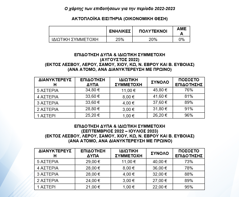 Όπως επισημαίνεται στην ανακοίνωση, και στο νέο πρόγραμμα ισχύουν αυξημένες τιμές επιδότησης, οι οποίες αφορούν σε όλες τις κατηγορίες καταλυμάτων, ώστε να καλυφθεί το αυξημένο κόστος και να εξασφαλιστεί μεγάλη συμμετοχή.
