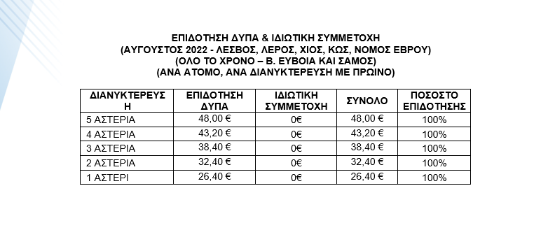 Ειδικά για καταλύματα στις νήσους Λέρο, Λέσβο, Χίο, Κω και στον νομό Έβρου, μπορούν να πραγματοποιηθούν έως 10 διανυκτερεύσεις και στα καταλύματα των Δήμων Ιστιαίας-Αιδηψού και Μαντουδίου-Λίμνης-Αγ. ‘Αννας της Β. Εύβοιας και της νήσου Σάμου έως 12 διανυκτερεύσεις εντελώς δωρεάν.