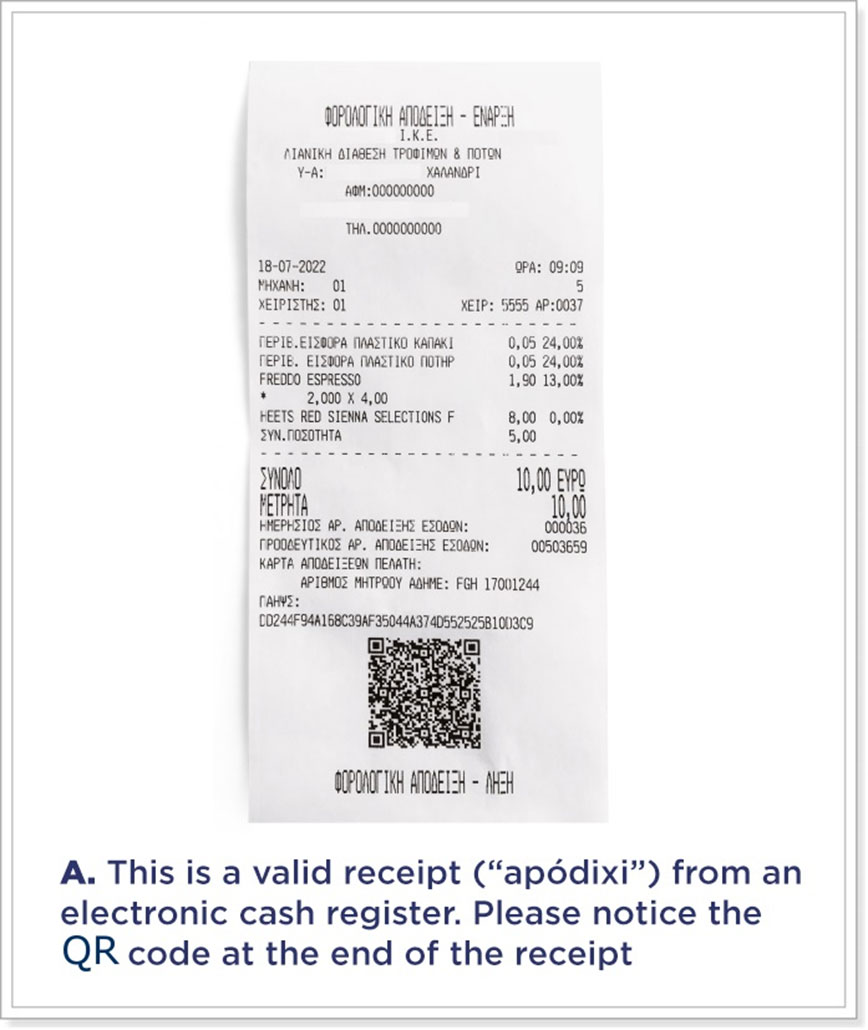 Επιπλέον, όλοι οι προμηθευτές αγαθών και υπηρεσιών υποχρεούνται να εκδίδουν αποδείξεις στους πελάτες τους. Ο καταναλωτής δεν είναι υποχρεωμένος να πληρώνει, σε μετρητά ή με κάρτα, εάν δεν του παρασχεθεί έγκυρη απόδειξη πληρωμής («apodixi»).