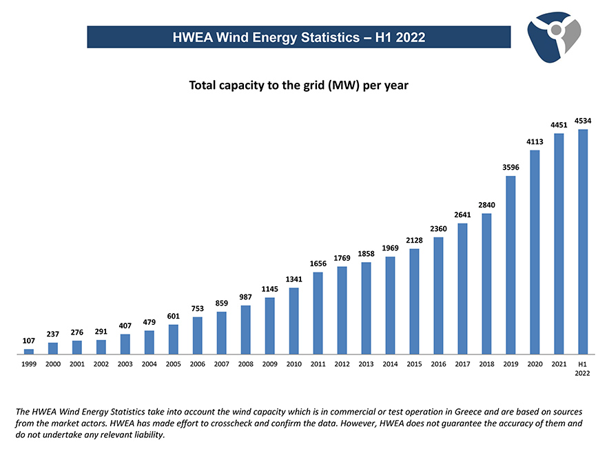 Στις 4.534 MW (μεγαβάτ) έφθασε η συνολική αιολική ισχύς στην Ελλάδα στο τέλος του Ιουνίου 2022, όπως προκύπτει από την εξαμηνιαία Στατιστική της Αιολικής Ενέργειας που ανακοίνωσε η Ελληνική Επιστημονική Ένωση Αιολικής Ενέργειας (ΕΛΕΤΑΕΝ).