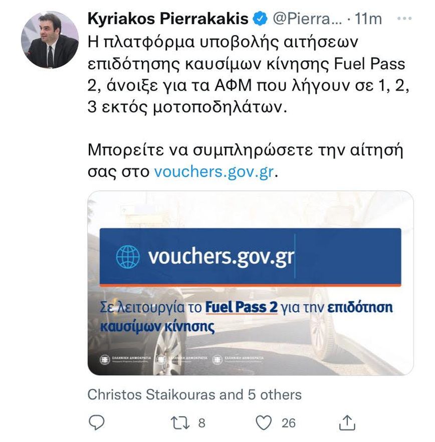Η πλατφόρμα υποβολής αιτήσεων επιδότησης καυσίμων κίνησης Fuel Pass 2, άνοιξε σήμερα το πρωί για τα ΑΦΜ που λήγουν σε 1, 2, 3 εκτός μοτοποδηλάτων. Σε μήνυμά του στο Twitter, ο υπουργός Ψηφιακής Μεταρρύθμισης, Κυριάκος Πιερρακάκης αναφέρεται στην έναρξη λειτουργίας της πλατφόρμας, σημειώνοντας ότι Μπορείτε να συμπληρώσετε την αίτησή σας στο http://vouchers.gov.gr.