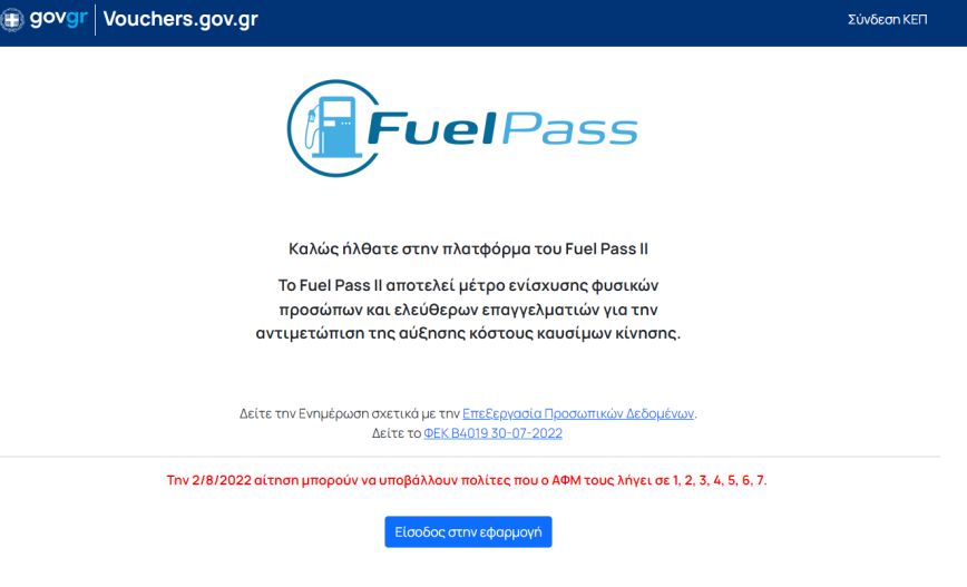 Υπενθυμίζεται η διαδικασία για την αίτηση επιδότησης καυσίμων Ιουλίου, Αυγούστου και Σεπτεμβρίου, ακολουθώντας τα ίδια βήματα που ίσχυσαν για την επιδότηση Fuel Pass 1: